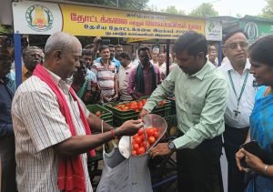 திருச்சி உழவர் சந்தையில் தக்காளி கிலோ ரூ.80 க்கு மாவட்ட ஆட்சியர் பிரதீப்குமார்IAS விற்பனையை துவக்கி வைத்தார்.