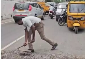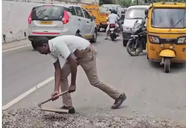 கோவை ‘நானே சரி செய்வேன்’ குண்டும் குழியுமாக இருந்த சாலையை சீரமைத்த போக்குவரத்து காவலர்   தமிழரசன்.