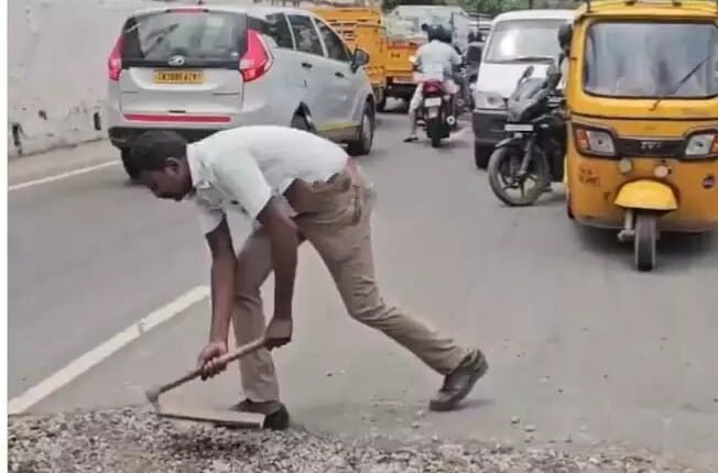 *நானே சரி செய்வேன்”…குண்டும் குழியுமாக இருந்த சாலையை சீரமைத்த போலீஸ் தமிழரசன்.