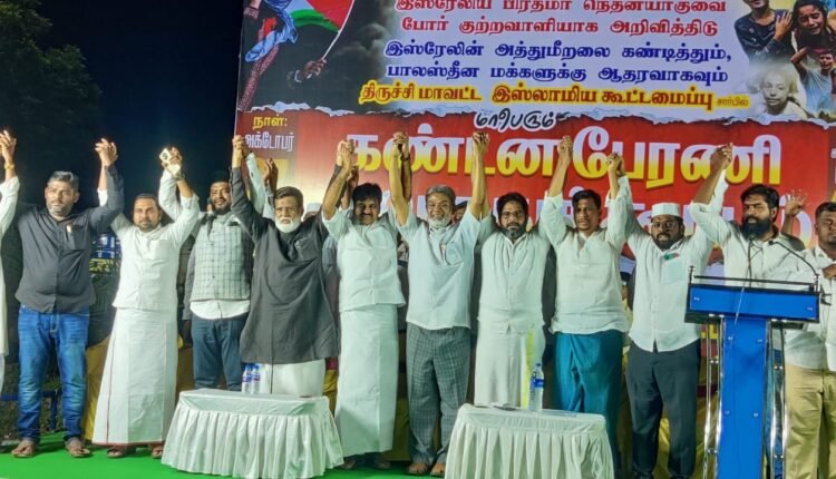 திருச்சி மாவட்ட இஸ்லாமிய கூட்டமைப்பு சார்பில் பாலஸ்தீன மக்களுக்கு ஆதரவாக மாபெரும் பொதுக்கூட்டம் பெண்கள் உட்பட ஆயிரக் கணக்கானோர் பங்கேற்பு.