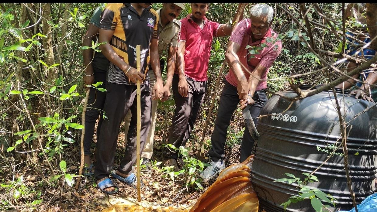 இந்நிலையில் கள்ளக்குறிச்சி மாவட்ட காவல் கண்காணிப்பாளர் அவர்கள் நேரடி தலைமையில் தனிப்படை காவலர்கள் அதிகாலை முதல் கல்வராயன்மலை பகுதியில் தேடுதல் வேட்டையில் ஈடுபட்டபோது குரும்பாலூர் கடுக்கம்பட்டு ஓடையில் மறைத்து வைத்திருந்த கள்ளச்சாராயம் காய்ச்ச பயன்படும் புளித்த சாராய ஊறல் 500,லிட்டர் வீதம் பிடிக்கக்கூடிய 07 பிளாஸ்டிக் பேரல்களில் 2,500 லிட்டர் சாராய ஊறல் கண்டுபிடித்து சம்பவ இடத்திலேயே கொட்டி அழிக்கப்பட்டது.