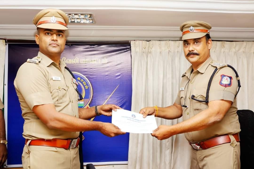 திருநெல்வேலி மாவட்ட காவல்துறை மாதாந்திர ஆய்வுகூட்டம் காவல் அதிகாரிகளுக்கு பாராட்டு சான்றிதழ் வழங்கிய மாவட்ட SP.N.சிலம்பரசன்.