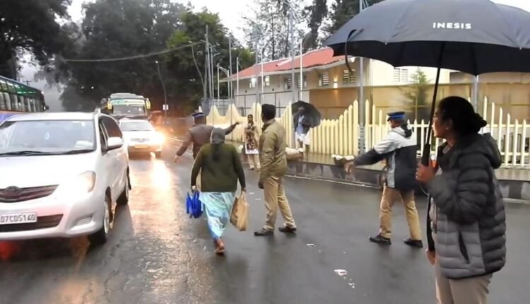 கொட்டும்மழையிலும் குடைபிடித்துகொண்டு போக்குவரத்தைசீர்செய்த கொடைக்கானல் காவல்துறையினர்.