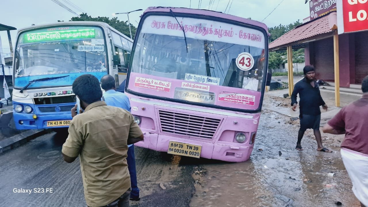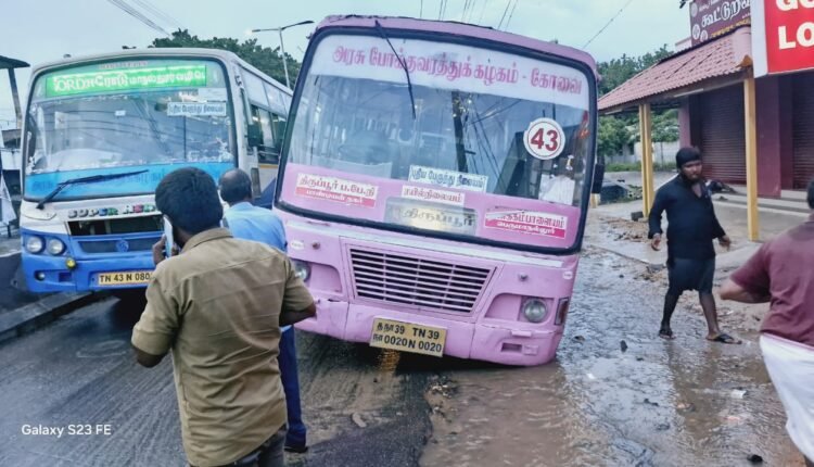 திருப்பூர் பி. என். ரோடு. சாலையில் கவிழ்ந்த அரசு பேருந்து அதிகாரிகளின் அலட்சியத்தால் பொதுமக்கள் உயிர் ஊசல்.