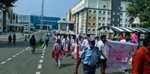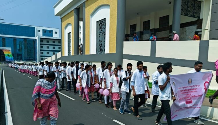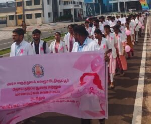 திருப்பூர் அரசு மருத்துவக் கல்லூரி மாணவ மாணவிகள் மார்பகப் புற்றுநோய் பற்றிய விழிப்புணர்வு பேரணி மருத்துவக் கல்லூரி முதல்வர் டாக்டர். முருகேசன் துவக்கி வைத்தார்